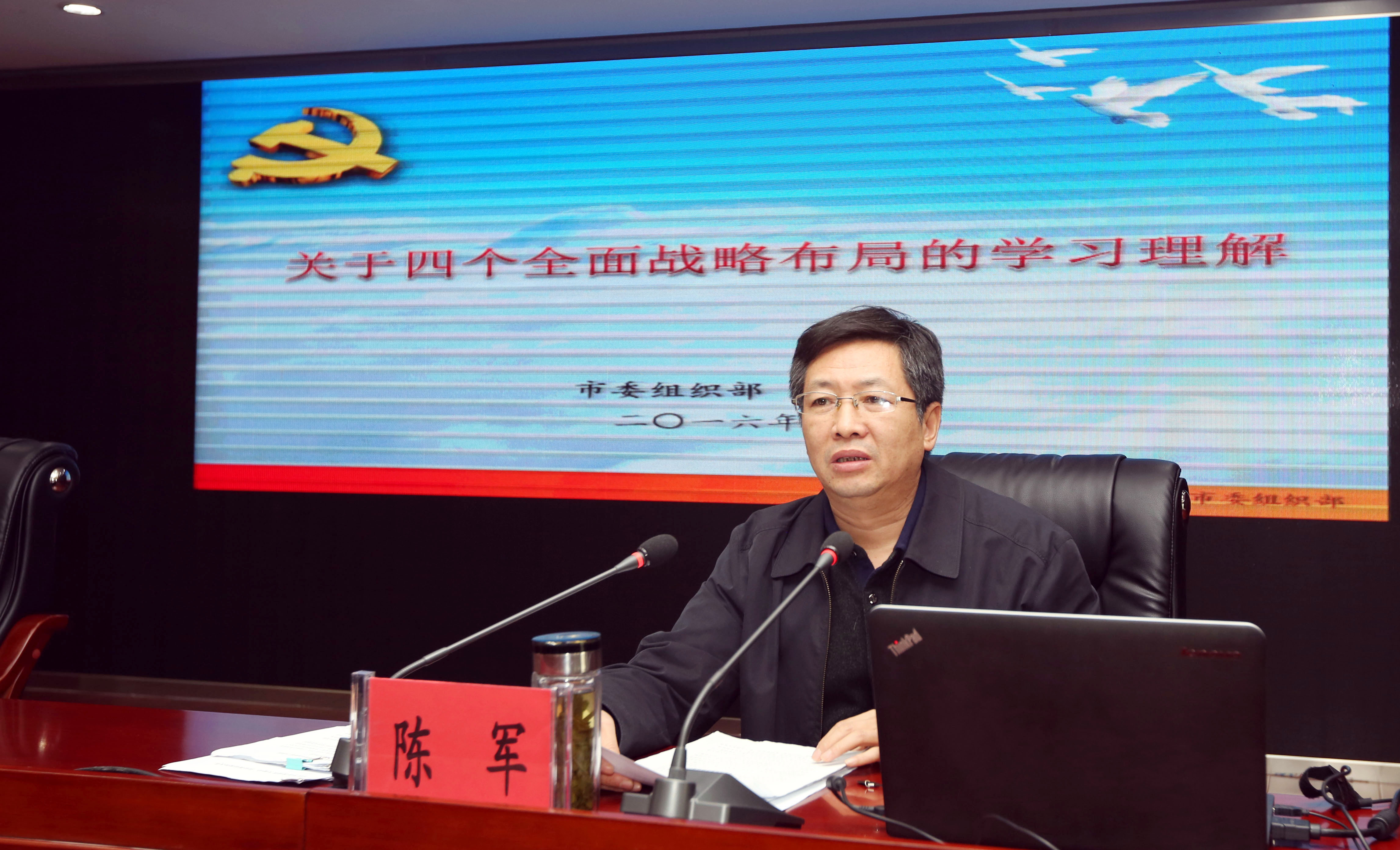 11月4日下午,集團公司黨委召開中心組學習(擴大)會,邀請市委組織部副部長、市委黨建辦主任、組織員辦公室主任陳軍就“四個全面”的學習和理解作專題輔導報告。集公司黨委書記、董事長楊龍主持會議,集團公司領導班子成員,各權屬單位領導班子成員、黨群有關部門負責人,集團總部全體管理人員參加會議。