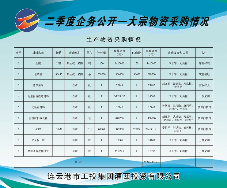 1、由集團公司集中采購塑料布(鹽膜)150噸(由工投集團運營監管部在總部組織招標)、包裝袋20萬條,實購金額計169.953萬元。