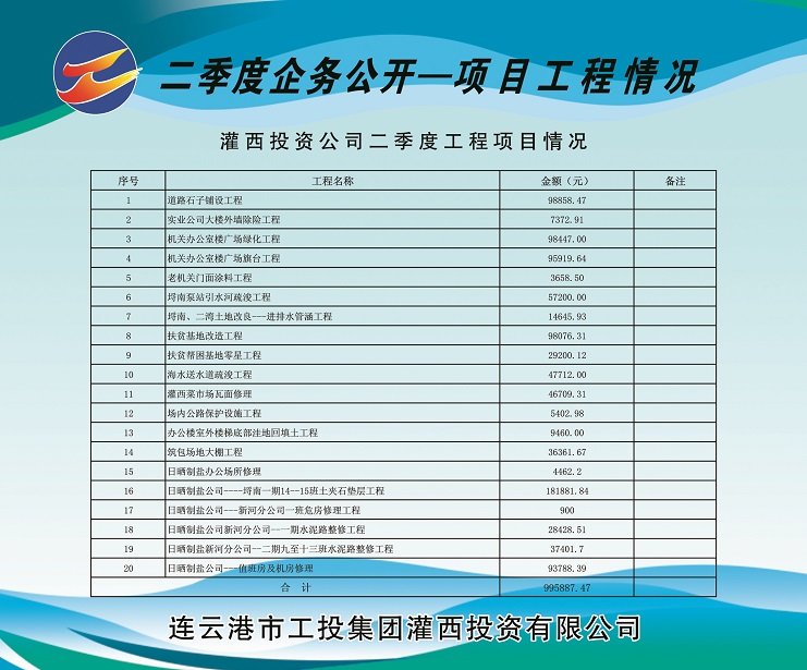 道路石子鋪設工程98858.47元;實業公司大樓外墻除險工程7372.91元;機關辦公樓廣場綠化工程98447.00元;機關辦公室樓廣場旗臺工程95919.64元;老機關門面涂料工程3658.50元;埒南泵站引水河疏浚工程57200.00元;埒南、二灣 土地改良—進排水管涵工程14645.93元;扶貧基地改造工程98076.31元;扶貧幫困基地零星工程29200.12元;海水送水道疏浚工程47712.00元;灌西菜市場瓦面修理46709.31元;場內公路保護設施工程5402.98元;辦公樓室外樓梯底部洼地回填土工程9460元;筑包場地大棚工程36361.67元;日曬制鹽辦公場所修理4462.2元;日曬制鹽公司---埒南一期14—15班土夾石墊層工程181881.84元;日曬制鹽公司---新河分公司一班危房修理工程900元;日曬制鹽公司新河分公司—一期水泥路整修工程 28428.51元;日曬制鹽新河分公司一二期九至十三班水泥路整修工程37401.7元;日曬制鹽公司---值班房及機房修理93788.39元