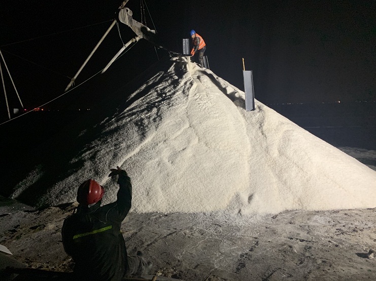 自3月3日上午,埒南制鹽15個生產班組共出動5臺扒鹽機組投入春扒工作,截止3月9日,5臺機組共計扒完結晶池51塊,共扒原鹽2.5萬余噸。