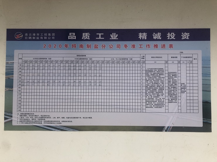 為更好落實“冬準”大會會議精神,11月17日上午,埒南制鹽公司制定冬準工作推進表,張貼在公司辦公區域墻面上,促進冬準工作有序開展。
