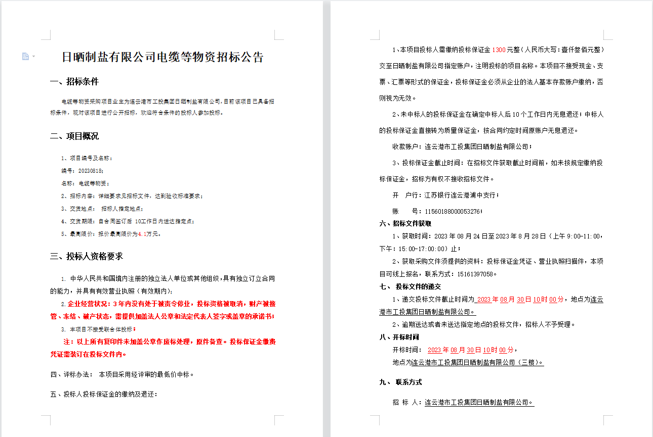日曬制鹽有限公司電纜等物資招標公告