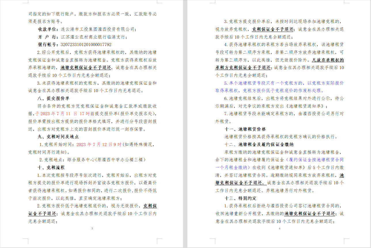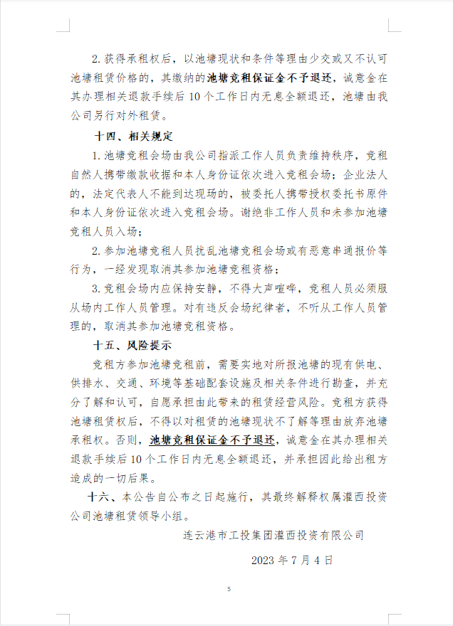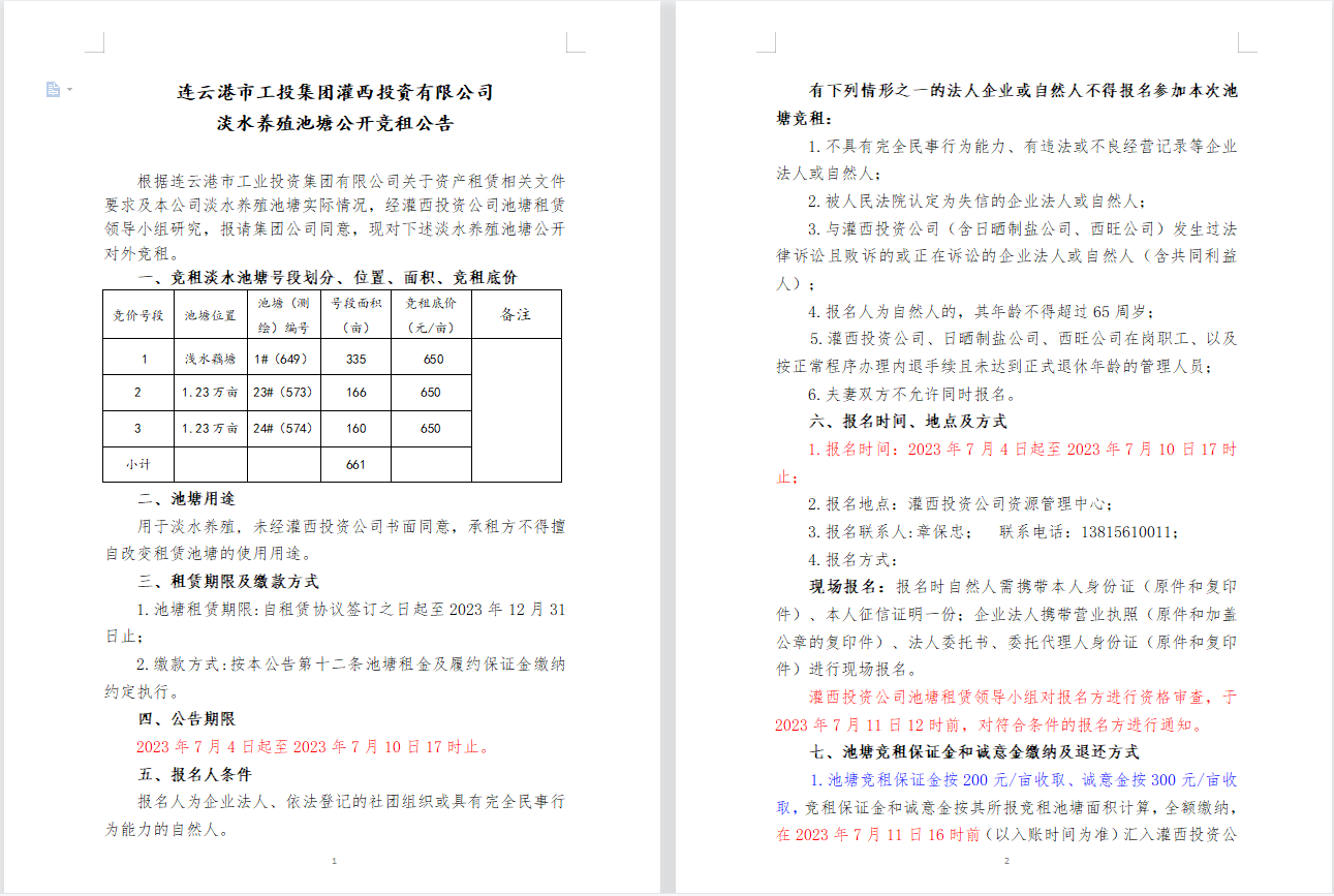 連云港市工投集團灌西投資有限公司淡水養(yǎng)殖池塘公開競租公告