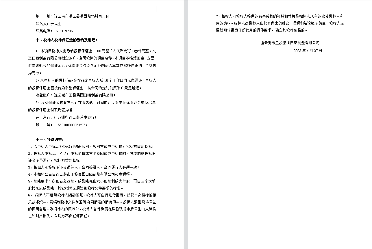 連云港市工投集團日曬制鹽有限公司聚乙烯繩采購項目招標公告