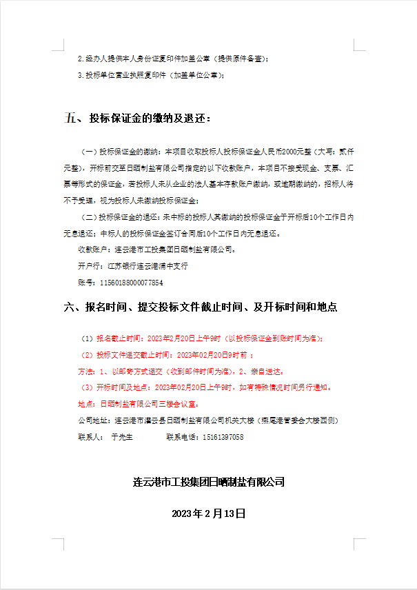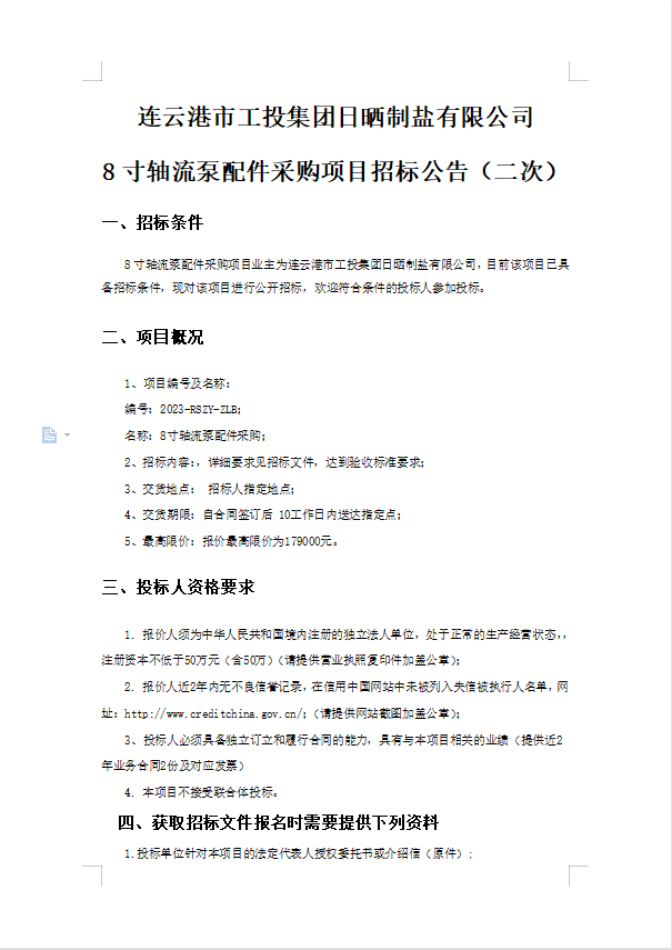 連云港市工投集團日曬制鹽有限公司8寸軸流泵配件采購項目招標公告(二次)