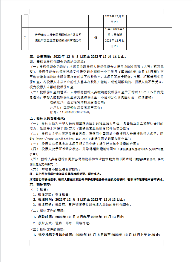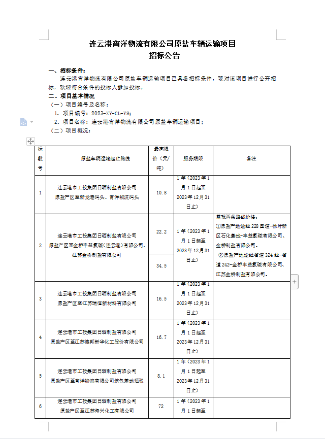 連云港宵洋物流有限公司原鹽車輛運輸項目招標(biāo)公告
