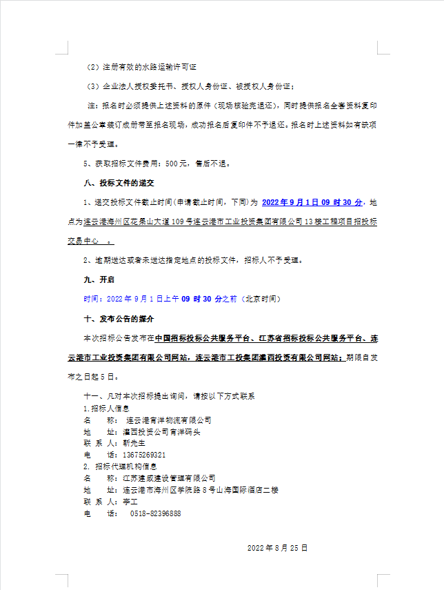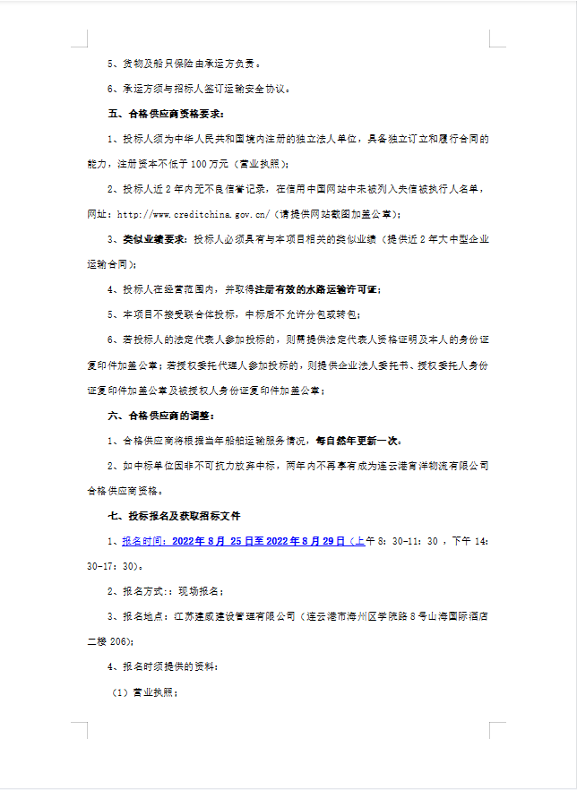 連云港宵洋物流有限公司船舶運輸服務業務招聘合格供應商招標(二次公告)