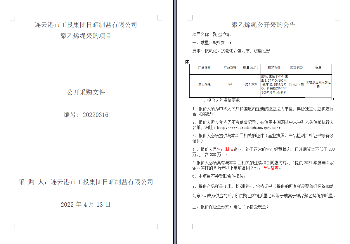 連云港市工投集團(tuán)日曬制鹽有限公司聚乙烯繩采購項(xiàng)目
