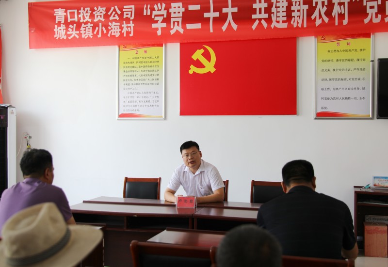 為推動黨的二十大精神在鄉(xiāng)村落地生根,6月28日上午,青口投資公司、城頭鎮(zhèn)小海村聯(lián)合開展“學(xué)貫二十大 共建新農(nóng)村”黨員課堂,由公司機關(guān)優(yōu)秀黨務(wù)干部組成的二十大精神宣講隊,走進結(jié)對共建的贛榆區(qū)城頭鎮(zhèn)小海村開展集中式、通俗化宣講。公司黨委副書記、工會主席梁永,城頭鎮(zhèn)副鎮(zhèn)長王延光,城頭鎮(zhèn)小海村支部書記徐坤參加活動。