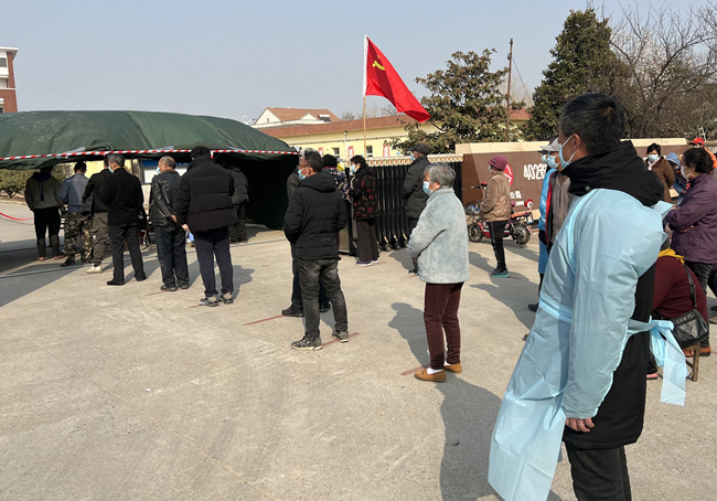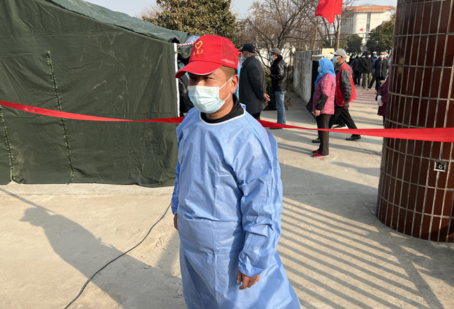 圖為黨員宋世園正引導(dǎo)居民做好核酸檢測準(zhǔn)備工作