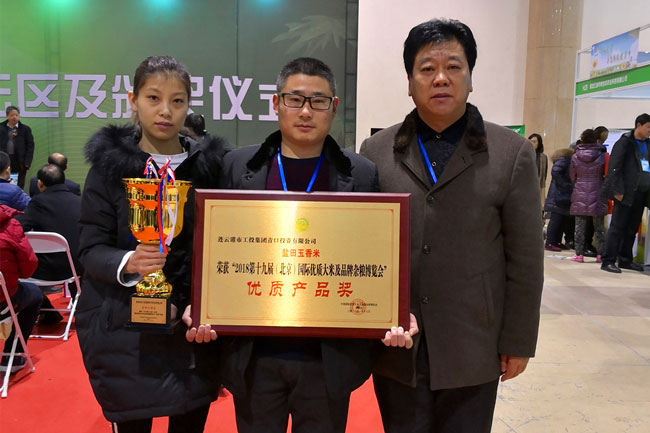 新年伊始,萬象更新,公司 “鹽田玉”大米再獲重量級榮譽(yù)。在 2018第十九屆(北京)國際優(yōu)質(zhì)大米及品牌雜糧博覽會上,我公司鹽田玉香米經(jīng)過產(chǎn)品品質(zhì)檢測、品嘗、營養(yǎng)分析等程序?qū)徍耍耆显u獎要求,在600多家參展企業(yè)中脫穎而出,被授予“優(yōu)質(zhì)產(chǎn)品獎”榮譽(yù)稱號。