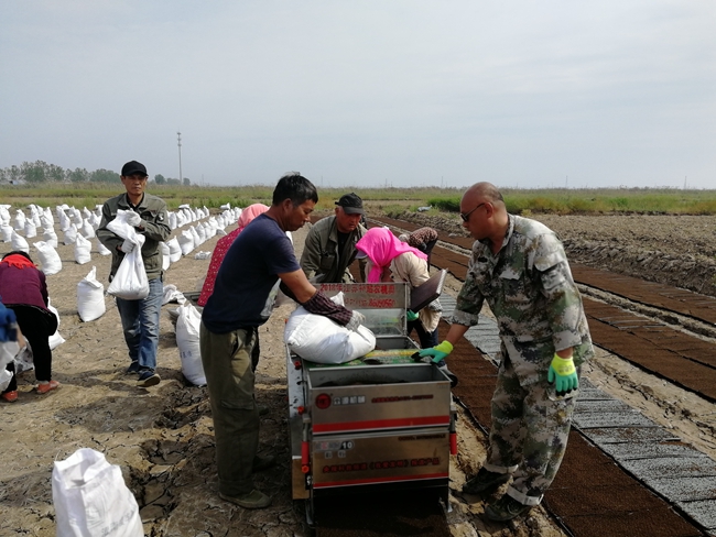 地頭播地龍育秧是最近兩年引進的機械化育秧方式,通過覆基質、播種、再覆基質,一次性完成播盤任務,條田工之間自愿組合合作購買播種機,互相配合共同完成育秧作業,大幅節約了成本、人工,減少了運輸、擺盤期間損苗現象;大棚塑盤暗化育秧,條田管理工互幫互助,自行組織運輸車輛轉運秧苗至田頭,將轉運時間由一天半壓縮至半天就能完成,并順帶空盤回大棚,不僅減少了轉運時間,大大降低了運輸成本,又促進了職工之間團結互助關系。