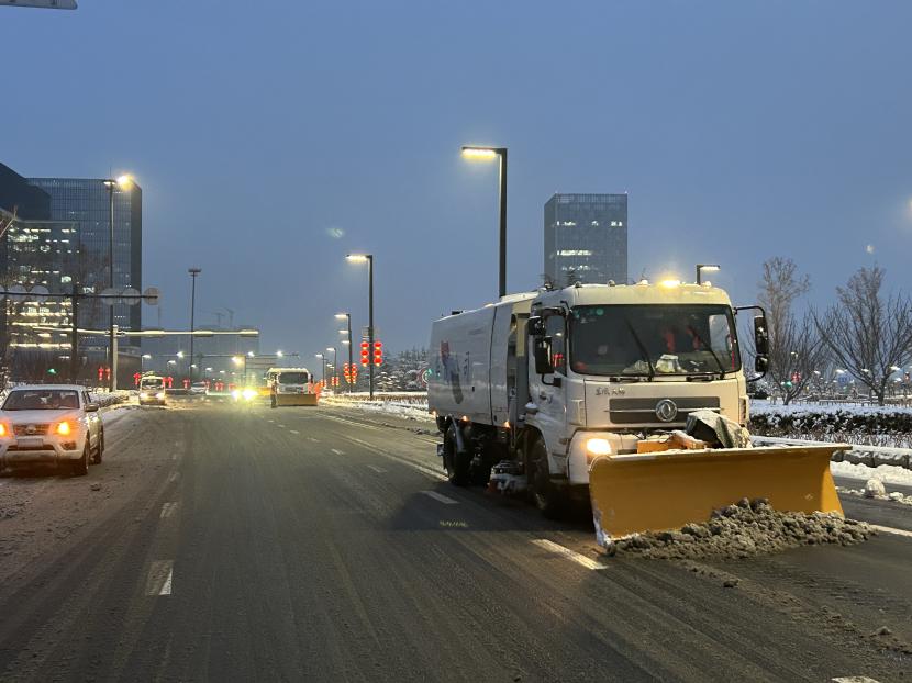 上午10時(shí)許,暴雪如約而至。裝有融雪劑的車輛全部整裝待發(fā),聞令而動(dòng),采取“人工+機(jī)械”不間斷作業(yè)模式,對(duì)轄區(qū)主次干道、橋涵、火車站東站、創(chuàng)智大廈等帶坡路段及時(shí)拋撒融雪劑,采取“滾刷+鏟車”組合方式,反復(fù)排掃路面積雪,確保主次干道、帶坡路段通暢無冰。