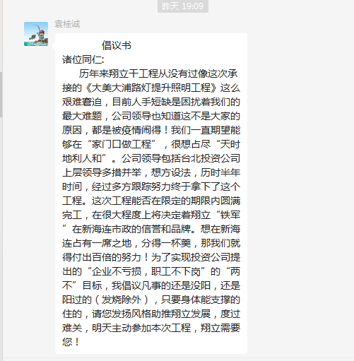 ? ? ? ??運籌帷幄,統籌安排。每天早上7點多,都會看到翔立廠房前的靚麗風景線,那是鐵軍們正在進行早班會:強調工作需要注意的安全點,進行現場分配工作,互相鼓勵打氣,充分調動大家的積極性;晚上結束一天勞累的工作,鐵軍們也沒有閑著,在工作群中熱烈的討論工作情況,大家心往一處想,勁往一處使,彼此間相互鼓勵,努力高質量的完成路燈工作。雖然疫情影響減員嚴重,但是大美大浦亮化工程,7條主干道,翔立已經完成了6條,大浦路需要把路燈上的方管變成圓管,才能進行更換,翔立分公司未雨綢繆,及時聯系廠家送來配件,確保工程不停工。