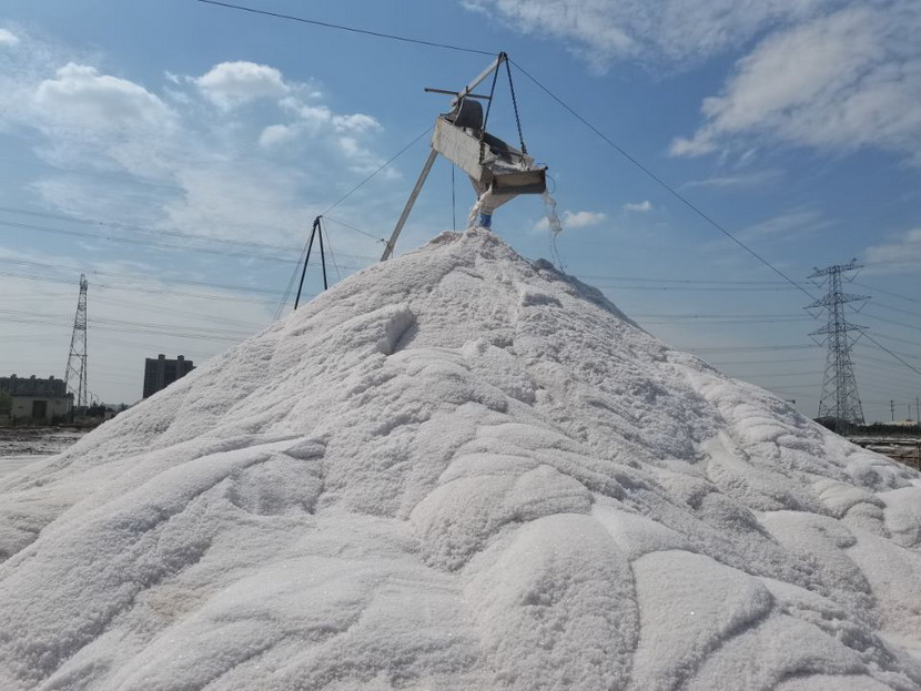 遠處,凌空飛架的高壓電線下,白花花、明晃晃的鹽廩,有如干凈、潔白的雪山,景象十分美麗。