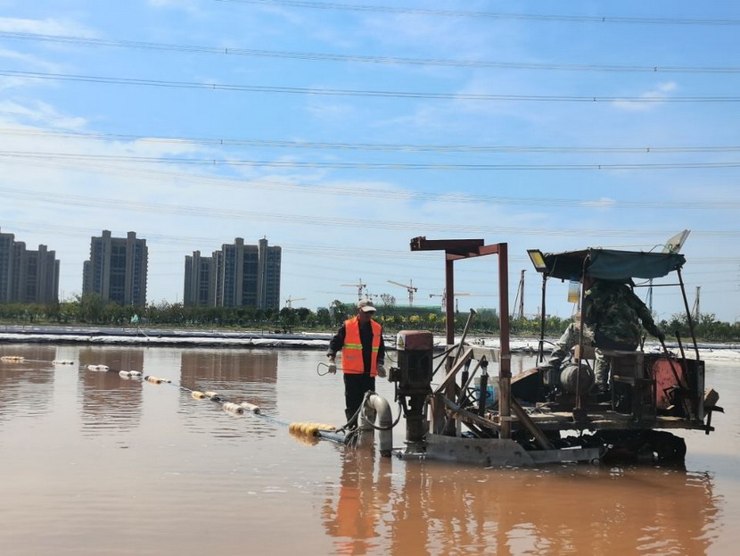 第一片180公畝的曬鹽池已經收鹽完畢,工人師傅們嫻熟有序用塑布對鹽廩進行覆蓋,預防雨水造成鹽斤淌化。