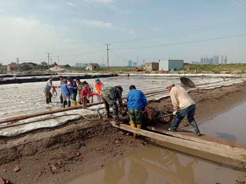 養殖池邊,工作人員仔細的對河道清淤進行現場勘查,確保排水通暢。