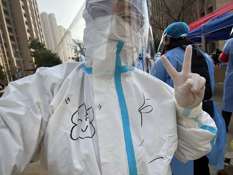 ? 3月12日,晴,8:00到達(dá)社區(qū)核酸采樣點,準(zhǔn)備上崗,社區(qū)負(fù)責(zé)人給我們進(jìn)行了“防護(hù)服穿脫”及防疫知識的講解學(xué)習(xí)等一系列十分細(xì)致地培訓(xùn)后,有點興奮的穿好“大白服”,帶上手套、頭套和面罩,社區(qū)阿姨還幫我在衣服上畫上了可愛的涂鴉;