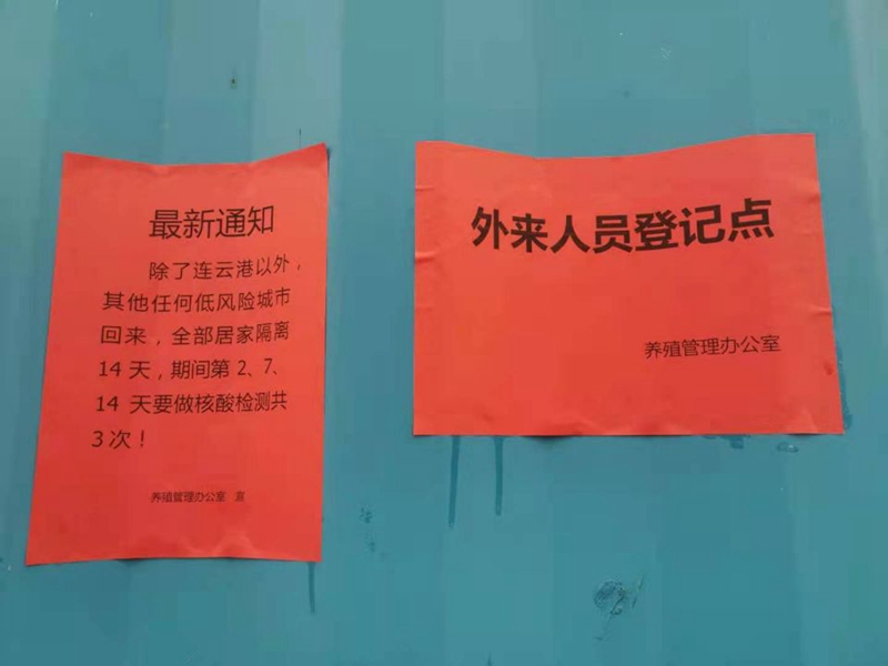 養殖管理辦公室迅速反應,成立防疫領導小組,加強值班值守,設置疫情防控設置隔離點、外來人員登記點,張貼疫情動態通知。養殖辦全員到“塘頭”排查是否有人員與中高風險地區回連人員的接觸史(包括家人和周邊鄰居)和疫苗接種情況;對來往車輛和人員進行逐一登記排查,宣傳防疫注意事項;并要求養殖戶不得雇傭除了連云港以外人員干活、不得讓除了連云港以外人員或車輛在池塘進出。
