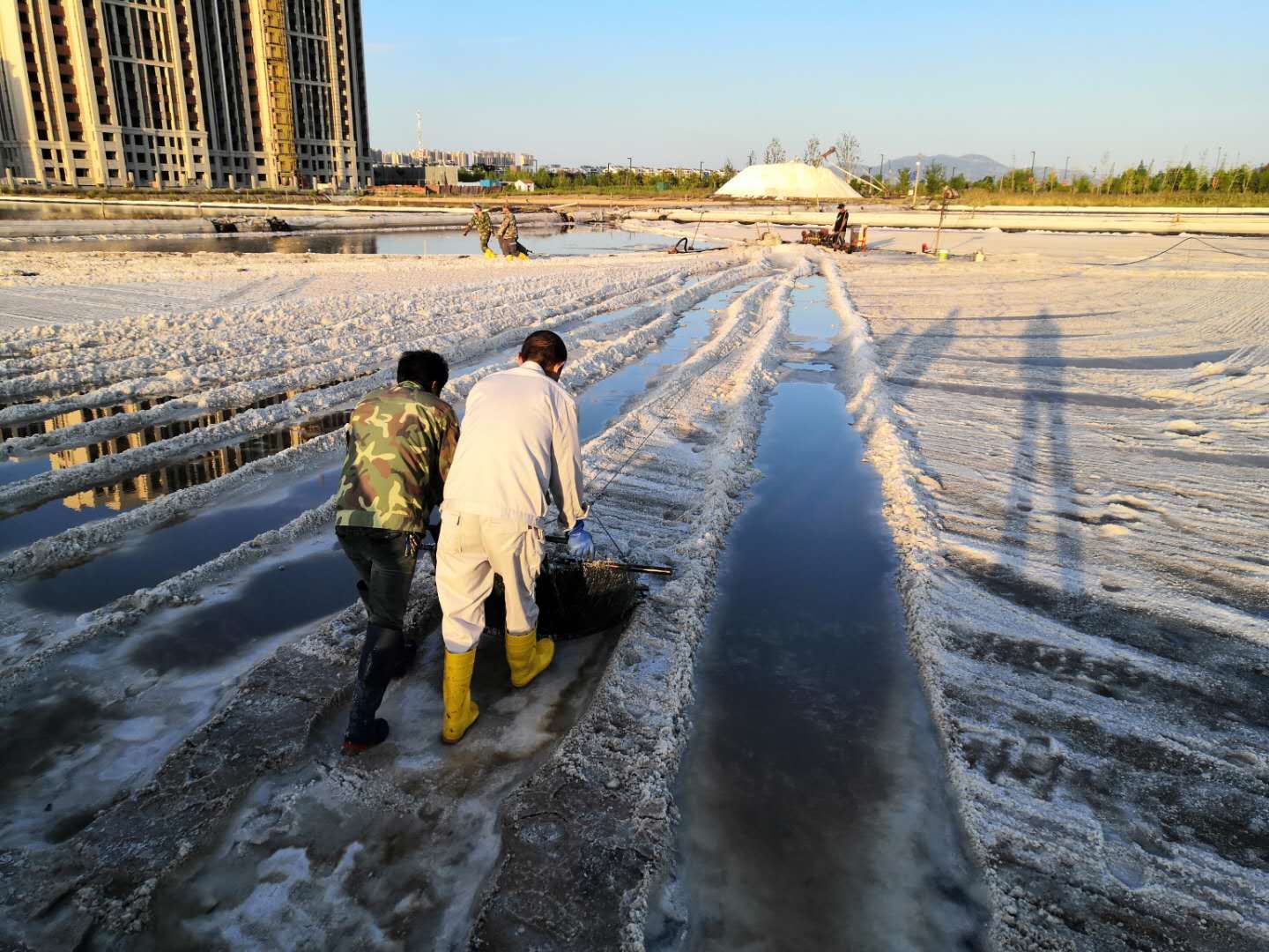 工區加大結晶工藝調整力度,塑苫布及蓋及收,不放過1毫米蒸發量,真正做到“云彩縫里奪鹽斤”。對走完鹽的廩基進行泡制,充分挖掘制鹵潛力,抓好窮制鹵。嚴把結晶灌池關、鹵水進池關、塑池管理關、結晶環境關,搶天時、抓制鹵、促工藝、結合實際加深水工,強制飽和鹵水。針對1415班已征用灘地,在機械扒鹽后又用人工進行二次扒鹽,將塑池內的鹽斤徹底收回,真正做到顆粒歸倉,為完成原鹽生產計劃盡心、盡力。