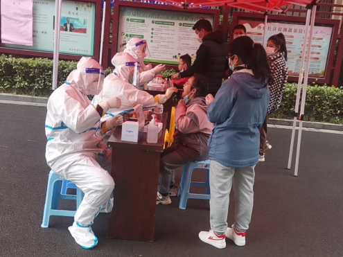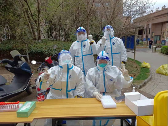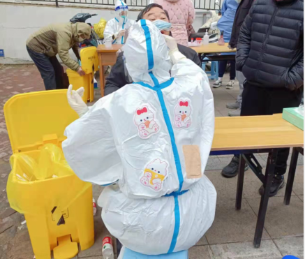 ? ? 12日? 7點集合,領裝備,鑒于昨天的教訓,早上沒喝水,吃了兩口飯,要不大白服就浪費了。出了點意外,排小區把我們小區給忘了,沒醫生來支援,就三個醫生,三個點,三張臺,隊伍排的那叫一個長。“請大家把健康碼打開,保持一米距離,戴好口罩!”這是我上午說的最多的幾句話。咱們贛榆的醫生非常辛苦,累了一上午,下午還要采黃碼,掃樓,向他們致敬!中午剛領盒飯就通知徐州支援的醫生到了,來了十幾個,扒拉兩口飯,開始穿裝備。第七輪結束,感覺人都廢了,渾身濕透,嗓子疼,不想動!